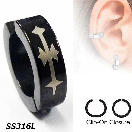 ブラックコーティングしたスタイリッシュなステンレスイヤリングにマッドゴールドの十字架をデザインしたイヤーカフ。