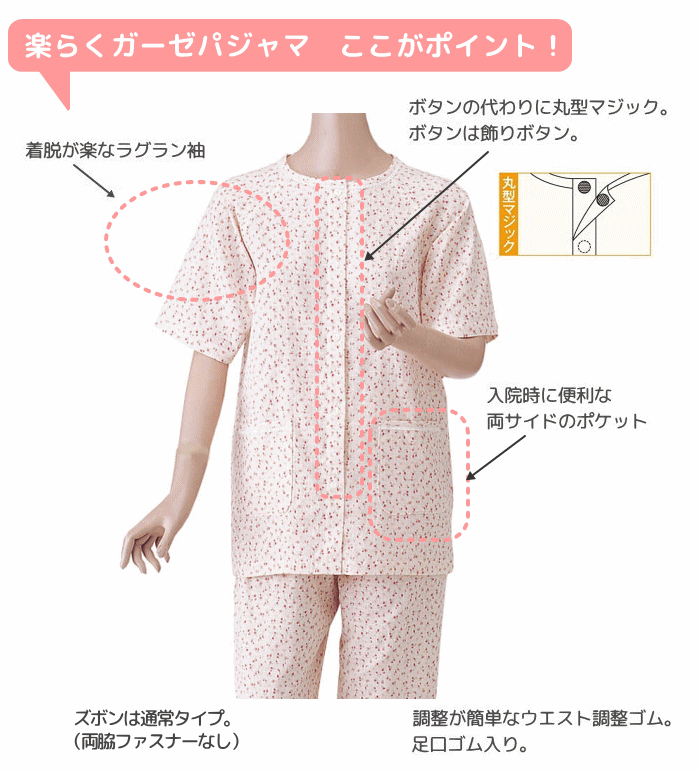 商品について 商品名 婦人楽らくガーゼパジャマ 上下セット(半袖)薄手春夏向き マジック式 サイズ S/M/Lサイズ 素材/材質 綿100% 特徴 綿のガーゼ生地100%です。