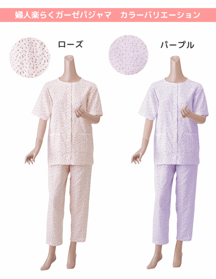 【婦人用・S〜L】レディース 楽らくガーゼパジャマ 半袖(No.900) 上下セット 神戸生絲 前開きマジック式 ローズ/パープル 春夏用 ガーゼ素材 綿100% S/M/Lサイズ【送料無料】